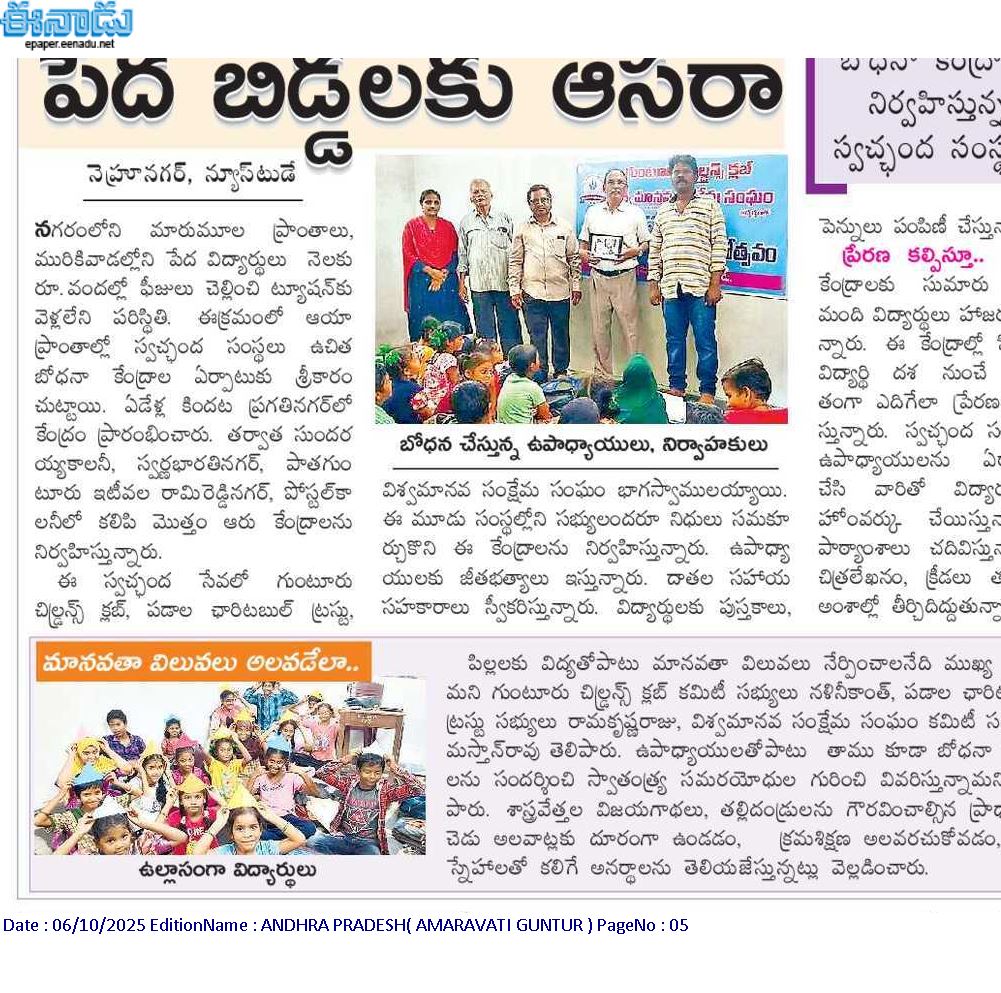 పేద విద్యార్థులకు సహాయంగా మనం చేస్తున్న కృషిని గుర్తించి గుంటూరు "ఈనాడు" పేపర్లో ప్రత్యేకంగా వార్త రాశారు